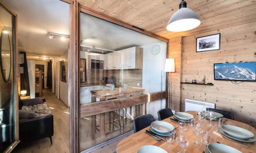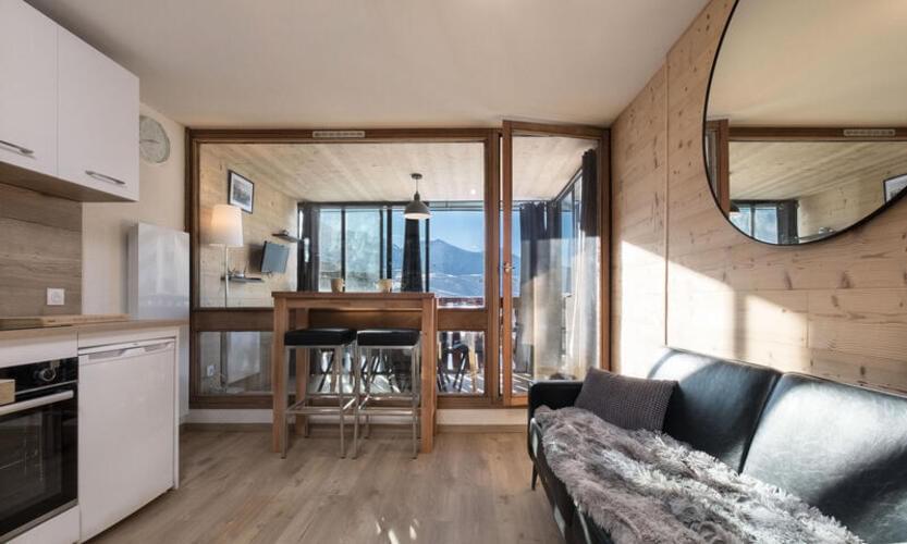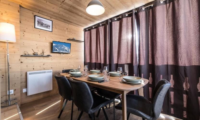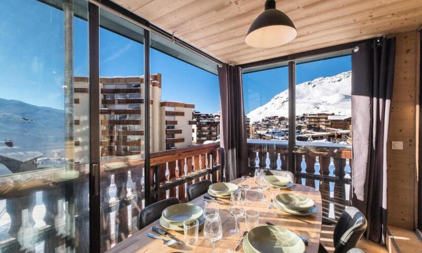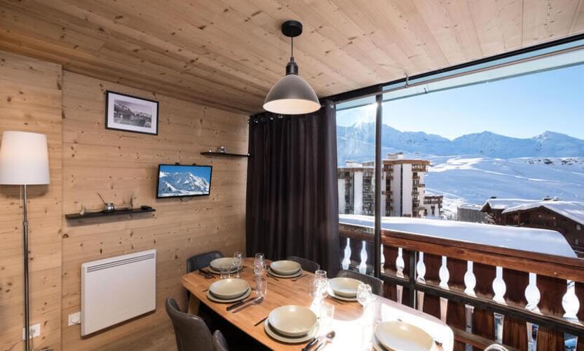 Appartamento rinnovato di 41 m2 per 6 persone con una splendida vista panoramica sulle montagne e sulla stazione, esposto a sud. Si trova nella residenza Le Serac, in una zona tranquilla di Val Thorens a meno di 50 m dalle piste.